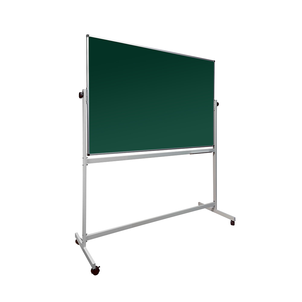 Поворотная передвижная доска, меловая, имеет темно-зеленую поверхность на металлическом каркасе, окрашенном порошковым методом под цвет алюминия. Имеется возможность изменения радиуса наклона доски. Поверхность предназначена для написания информации с помощью стандартного школьного мела.