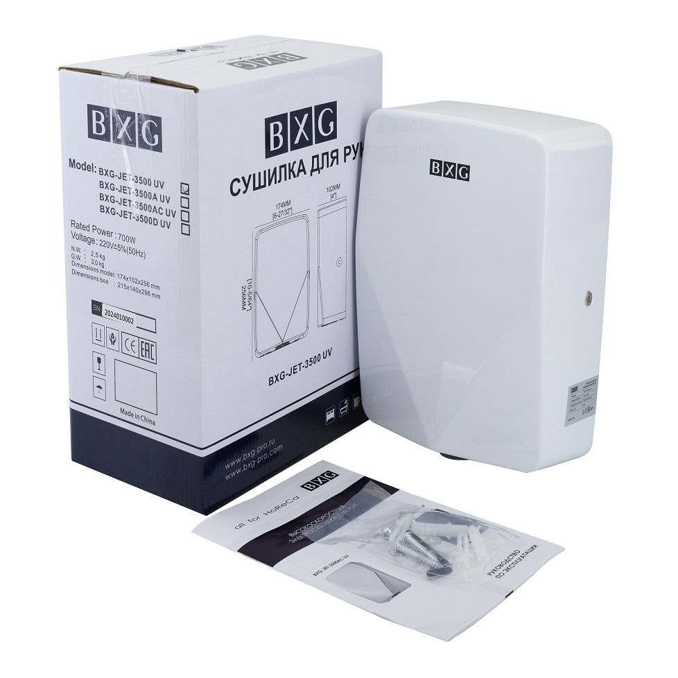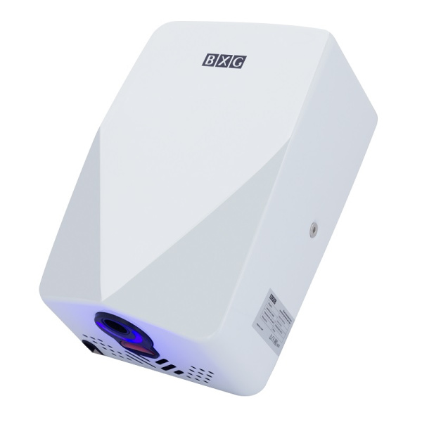 BXG-JET-3500 UV – Высокоскоростная сушилка для рук нового поколения с функцией Ультрафиолетового обеззараживания. Корпус сушилки выполнен из нержавеющей стали в стильном белом цвете в матовом исполнении.