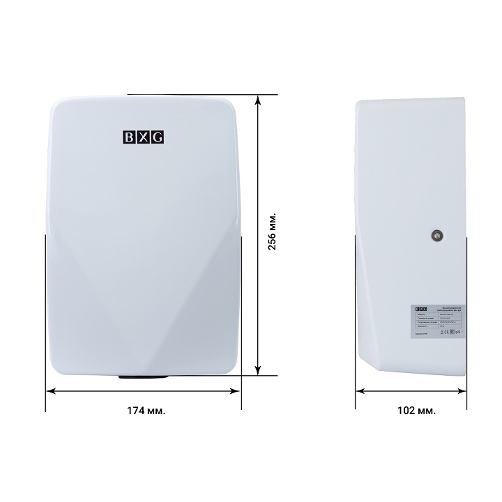 BXG-JET-3500 UV обладает самым высоким классом пылевлагозащиты IP24 (исключено попадание крупнодисперсной пыли а также влаги вовнутрь устройства со всех сторон). Благодаря ИК-датчикам и технологии микропроцессорного управления осуществляется независимый контроль, который предотвращает слишком долгое использование сушилки или использование не по назначению. Прибор оснащён устройством автоматического отключения на случай перегрева, короткого замыкания или скачков напряжения в электросети.