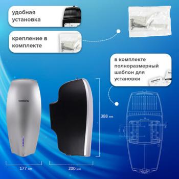 Мощность 1200 Вт обеспечивает время сушки рук за ~7 секунд. Стандарт IPX1 гарантирует защиту от брызг. Включается и выключается сушилка автоматически при помощи инфракрасного сенсора. Эргономичный дизайн, надежная конструкция и доступная цена делают данную модель идеальным вариантом для мест с невысокой проходимостью. В комплект входит набор для монтажа: шурупы с пластиковыми дюбелями и настенный кронштейн из нержавеющей стали. Подключается к сети 220V стандартной евровилкой.