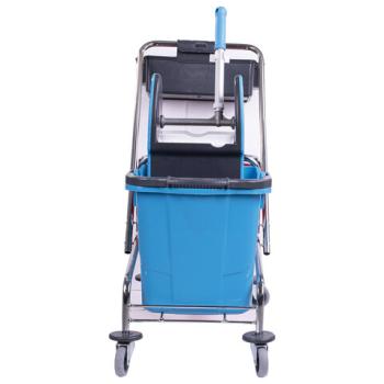 Представляет собой металлическую платформу на колесах с ведрами объемом 25 л каждое, механическим отжимом и корзинкой для бытовой химии на ручке. Корпус платформы изготовлен из хромированного металла, а инвентарь - из пластика. Тележка выполнена в трехцветном исполнении: красный, синий и серый. Колеса позволяют перемещаться в произвольном направлении.