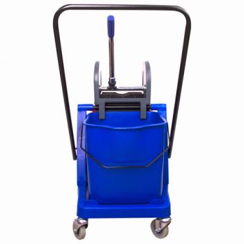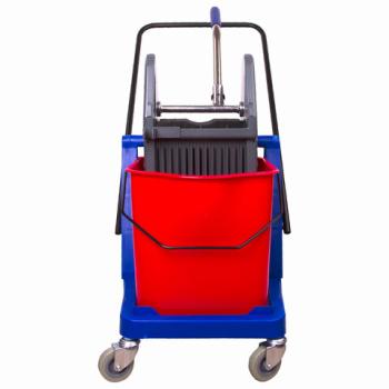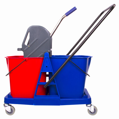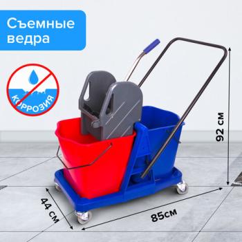 Представляет собой пластиковый каркас с установленными на него механическим отжимом для петельных тряпок и МОПов и 2 съемными ведрами по 23 л (рекомендованный объем каждого ведра - 20 л). База и инвентарь изготовлена из качественного пластика. Тележка выполнена в трехцветном исполнении: красный, синий и серый. Колеса позволяют перемещаться в произвольном направлении. Габариты - 92х44х85 см. Вес - 8 кг. Комплектация: отжим, 2 лотка, транспортная ручка, каркас.