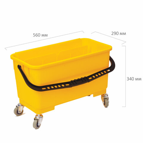 Прямоугольное ведро для мытья окон с отжимом для мопов и шубок. Ведро на 4-х поворотных колесах диаметром 50 мм, которые облегчают транспортировку. Вмещает до 24 л и используется с инструментами для чистки окон. Выполнено из пластика желтого цвета. Размер - 56х29х34 см. Вес - 2,5 кг.
