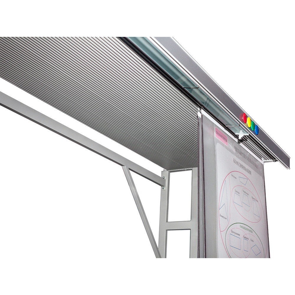 Металлическая мобильная конструкция с закрепленным алюминиевым карнизом для демонстрационных материалов.