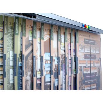 Эксклюзивный алюминиевый карниз стенда - это запатентованная демонстрационная система, разработанная специально для образовательных учреждений. Оснащена системой хранения и удобной демонстрации одновременно до 30 единиц плакатного материала.