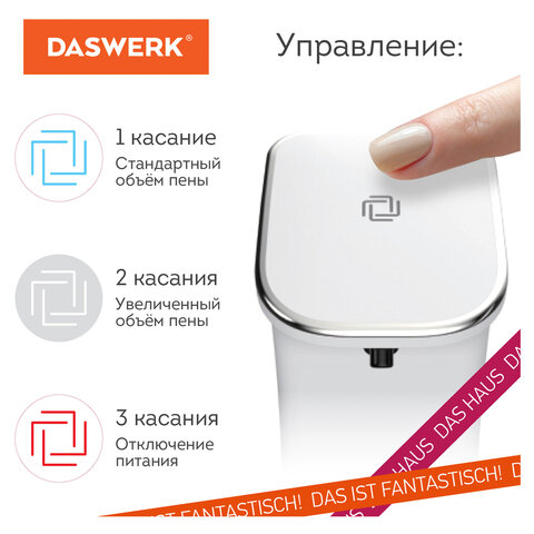 Сенсорный бесконтактный диспенсер для жидкого мыла/средства для посуды DASWERK обеспечивает максимальную гигиеничность и комфорт при мытье рук и мытье посуды.