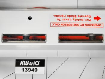 KW-triO 3949/13949, как правило, используют для резки различных бумажных бланков, визиток, а так же фотобумаги. Зажим стопы производится автоматически в процессе реза с помощью быстродействующего прижима, создающего давление на стопу, что позволяет сделать качественный рез стопы бумаги толщиной до 5 мм. Длина реза составляет 360 мм. При открытом защитном экране из ударопрочного ABS пластика со специальной системой блокировки ножа, нож удерживается в безопасном верхнем положении. Новая модель KW-triO 3949/13949 - дальнейшее развитие гильотины KW-triO 3948/13948, так у KW-triO 3949/13949 есть подсветка линии реза, а у KW-triO 3948/13948 её нет.