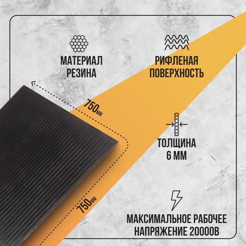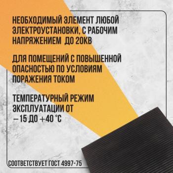 Коврик диэлектрический 750×750×6 мм линейное рифление. Размер 750×750 мм. Коврик диэлектрический толщиной 6+/-1 мм., имеет рифленую лицевую поверхность, одноцветный. Коврик диэлектрический является необходимым элементом любой электроустановки, рабочее напряжение которой не превышает 20 кВ. Диэлектрические коврики применяются в помещениях с повышенной опасностью и особо опасных по условиям поражения током. При этом помещения не должны быть сырыми и пыльными. Изготовлены в соответствии с требованиями государственного стандарта в зависимости от назначения и условий эксплуатации. 1-я группа — обычного исполнения. Защитные свойства: Эн, Эв. Температурный режим эксплуатации от −15 до +40 градусов Цельсия. Нормативно-техническая документация: ГОСТ 4997-75.