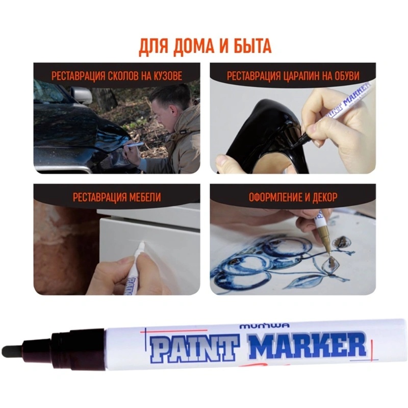 Маркер чёрного цвета — это профессиональный лаковый маркер на нитрооснове, предназначенный для использования на различных поверхностях, таких как металл, дерево, пластик, камень, бетон, стекло, резина и кожа. Он идеально подходит для реставрации дефектов на бытовой технике, обуви, кузовах автомобилей, а также для создания надписей и рисунков на каменных плитах.