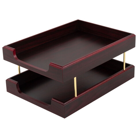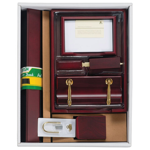 Все предметы изготовлены из дерева красного цвета с золотистой фурнитурой. Набор упакован в подарочную коробку, а также дополнительно в защитный гофрокорб для транспортировки.