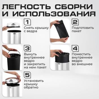 Внутрь ведра помещается съёмное пластиковое ведро с двумя ручками, изготовленное из PP. Ведро можно использовать как с пакетом для мусора, так и без него. При использовании пакета для мусора сначала необходимо снять крышку с ведра, поместить пакет внутрь, расправить его края таким образом, чтобы при помещении крышки на место она надежно прижимала края пакета.