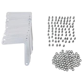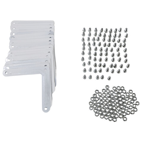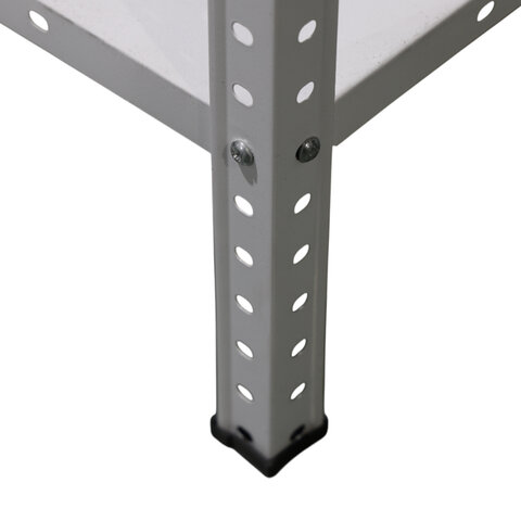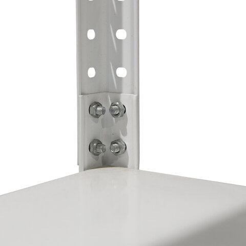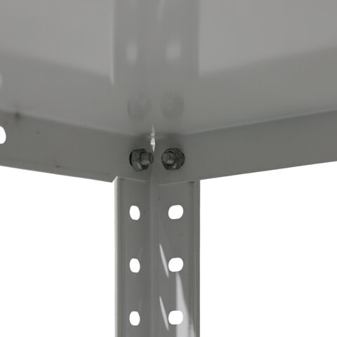 Для повышения жесткости всей конструкции верхнюю и нижнюю полку нужно усилить дополнительными Г-образными уголками (поставляются в комплекте 16 шт.). Промежуточные полки собираются без усиления.