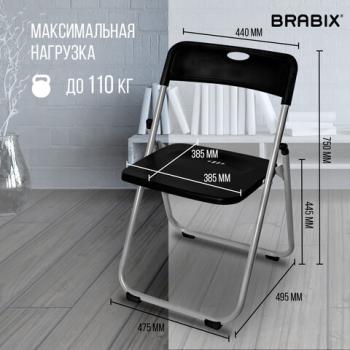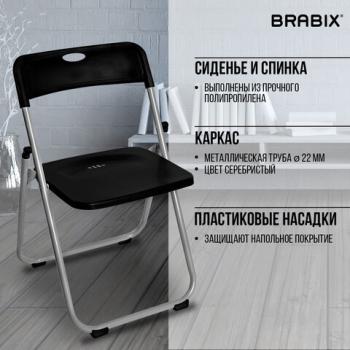 Спинка и сиденье выполнены из прочного полипропилена. Прочная рама из стали обеспечит долговечность эксплуатации, а пластиковые насадки на ножках не дадут испортить напольное покрытие. Модель имеет пластиковую спинку с эргономичным профилем. Складная конструкция сэкономит место при перевозке и хранении. Стул способен выдерживать нагрузку до 110 кг.