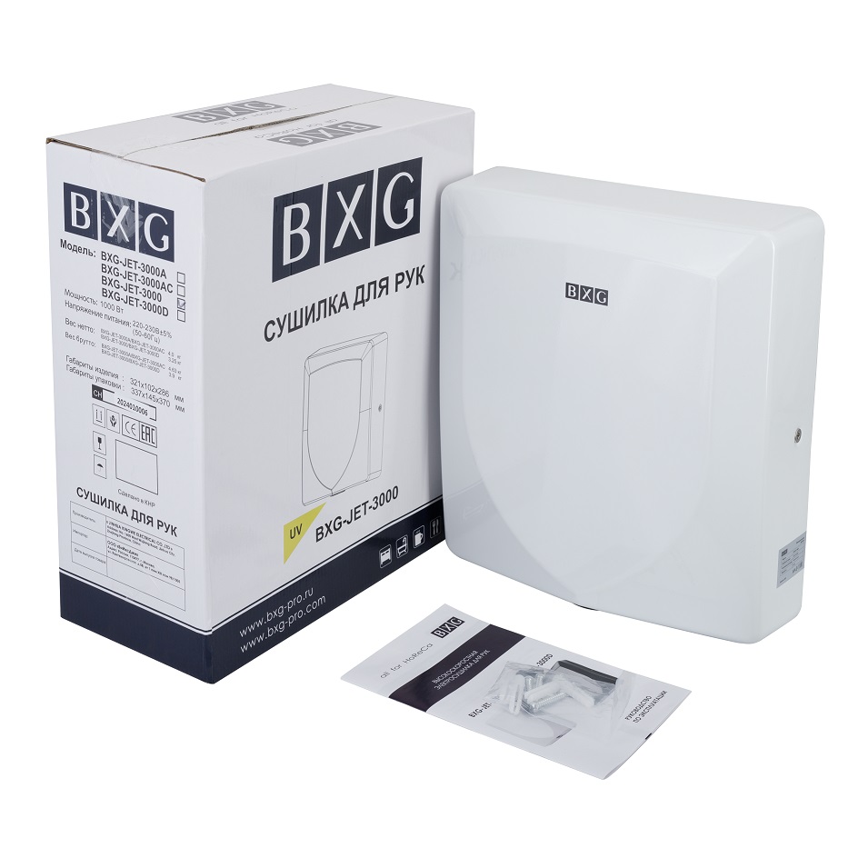 Дозатор для жидкого мыла Диспенсер для покрытий сидений на унитаз Автоматический освежитель воздухаBXG-JET-3000 – антивандальная высокоскоростная сушилка для рук нового поколения с функцией Ультрафиолетовой стерилизации Ultraviolet Cleanse. Корпус сушилки выполнен из нержавеющей стали в стильном белом цвете в матовом исполнении. Компактные размеры и супертонкий корпус (102 мм). Подойдет для использования в помещениях любой степенью проходимости с повышенными требованиями к безопасности и гигиене.