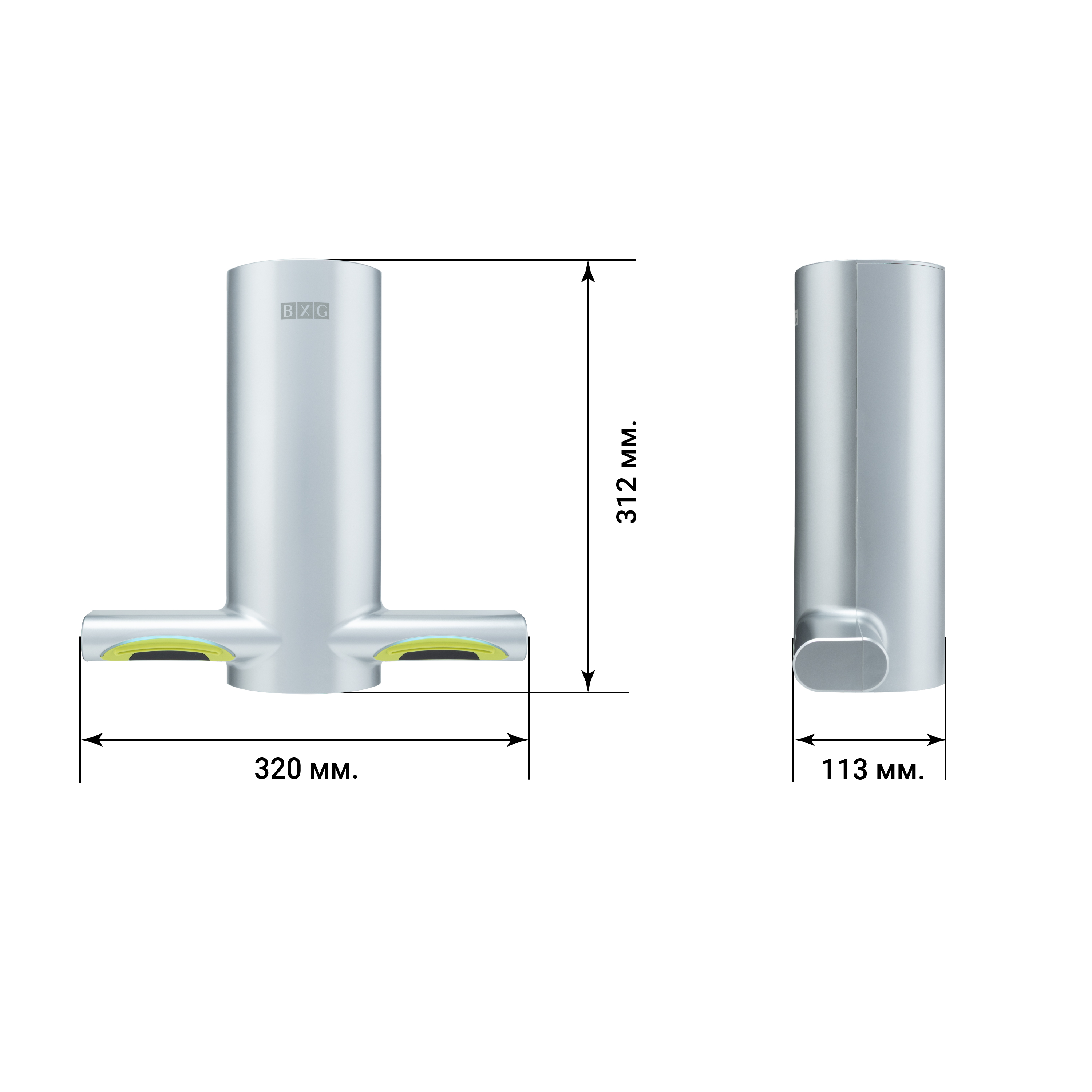 Элегантность: Дизайн сушилки выполнен в элегантном стиле. Воздуховодные отверстия размещены по корпусу с левой и с правой стороны для каждой руки раздельно! В состав воздуховодных отверстий дополнительно включены антибактериальные и антигрибковые компоненты, предотвращающие возникновение и размножение бактерий, грибков и плесени в воздуховодном тракте. Данная зона выделена специальным желтым цветом.
